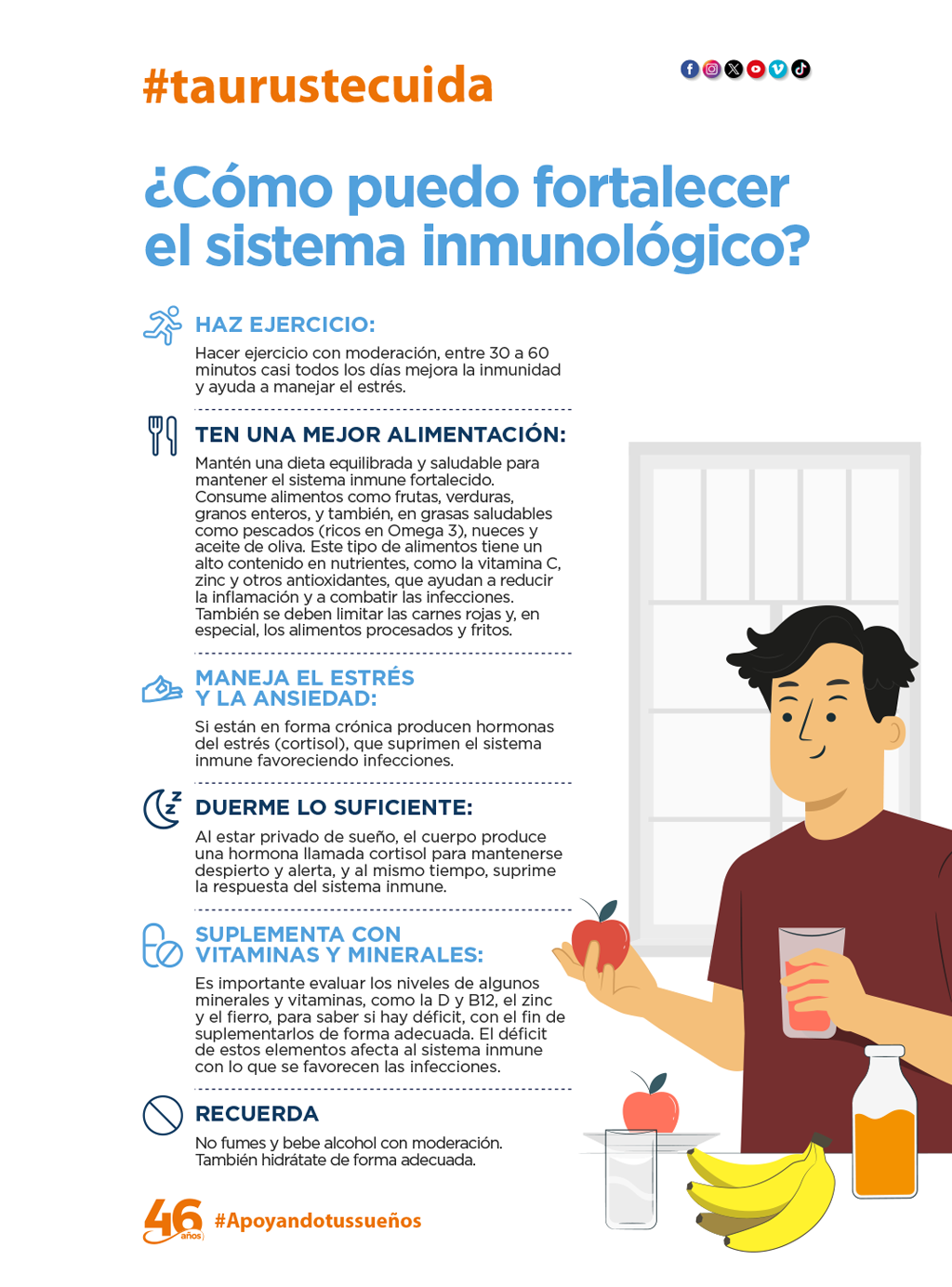 El organismo, a través del sistema inmune, protege al cuerpo de gérmenes y microorganismos. Por lo tanto es importante reforzarlo, sobre todo los adultos mayores, cuyo sistema inmune va envejeciendo, y las personas con patologías de base que favorecen su deterioro. Como buscamos tu bienestar, queremos darte estos consejos para que pases un invierno sano.